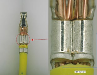 Parallèlement, une évaluation de l’aspect de la connexion des cosses par observation sous fort grossissement au microscope est indispensable pour contrôler en détail l’état de connexion et identifier la cause de tout défaut après essai ou en cas de problème. Les sections suivantes vous présentent les points de contrôle d’aspect essentiels pour chaque méthode de connexion.