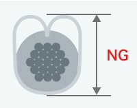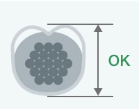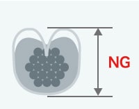 Sertissage excessif - Une hauteur de sertissage supérieure à la hauteur spécifiée entraîne un désengagement des brins en cas de traction, en raison d’un sertissage insuffisant. À l’inverse, une hauteur de sertissage inférieure à la hauteur spécifiée implique un enfoncement du fût entre les brins dû à un sertissage excessif, qui endommage le fil.