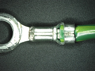 Le fil et la gaine sont sertis avec le fût de la cosse, exploitant la plasticité du fût. Le fût est plié par sertissage avec un outil ou une machine automatique sur une ligne de production.