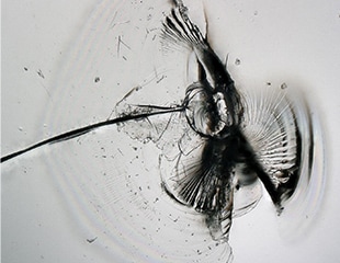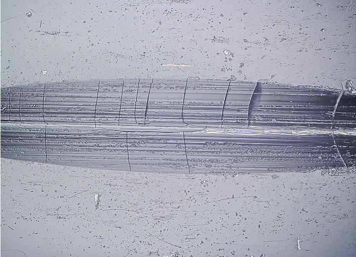 Le microscope est également doté d’une fonction de capture d’image HDR (haute plage dynamique), qui capture plusieurs images en faisant varier la vitesse d’obturation et les assemble en une seule image, riche en nuances. La texture de l’entaille de cassure d’une ampoule mais également les microscopiques fissures du contenant en verre, auparavant difficiles à observer en raison de leur faible contraste avec l’arrière-plan, sont capturées avec précision, fort contraste et sans aucun reflet.