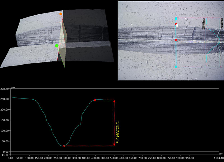 En outre, l’observation de l’état de la surface sur image 3D, la mesure 2D et 3D sans contact et non destructive des usinages microscopiques et la mesure du profil sur vue en coupe sont exécutées intuitivement par tout opérateur.