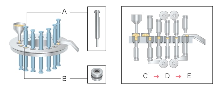 Le pastillage est réalisé par une presse à comprimés. Cette presse équipée de moules est également appelée comprimeuse rotative. L’ingrédient en poudre ajouté est automatiquement pesé et inséré dans la cavité de la matrice (partie fixe du moule). Puis, la partie mobile du moule, appelée poinçon, exerce une pression sur la poudre depuis le dessus et le dessous, pour former un comprimé. En production de masse, le remplissage en poudre, la compression dans le moule et l’éjection du comprimé sont réalisés en continu.