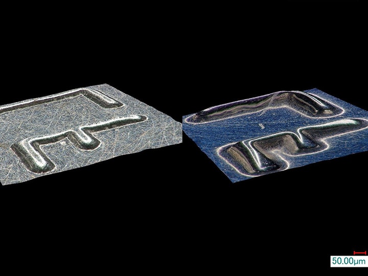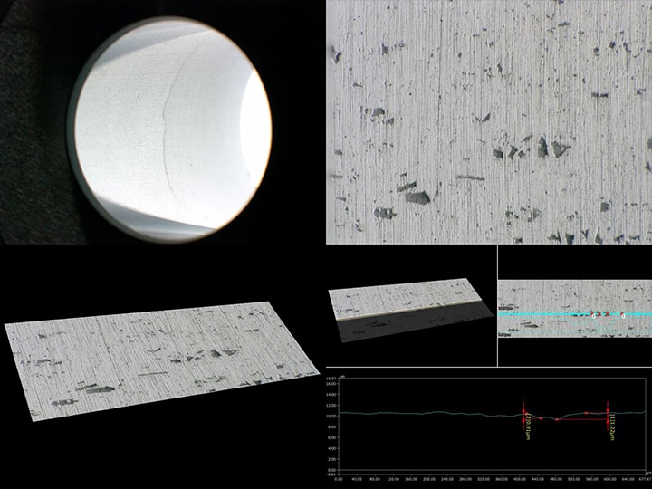 De plus, la rugosité de surface microscopique peut être modélisée en 3D directement à partir des images d’observation et visualisée sous tous les angles, permettant non seulement la mesure 3D mais également la mesure de profils par simple spécification de la position visée à l’aide de la souris. La hauteur et la profondeur des irrégularités microscopiques de la surface sont mesurées à l’échelle submicronique en n’importe quel endroit des parois internes de la matrice.
