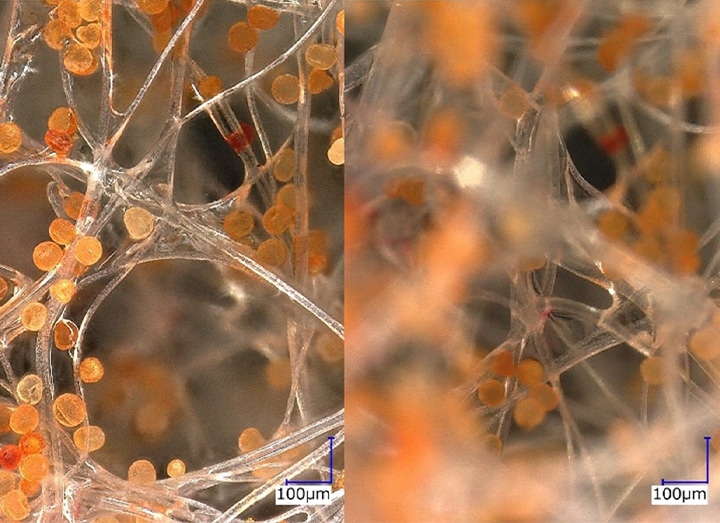 Le microscope numérique 4K Série VHX est équipé de la fonction de composition en profondeur, qui capture plusieurs images en différentes positions de mise au point et les assemble. Une image entièrement nette sur l’ensemble du champ de vision est alors obtenue même sous fort grossissement. Cette fonction permet d’observer en détail non seulement les fibres tridimensionnelles du filtre mais également les pollens accrochés à ces fibres.