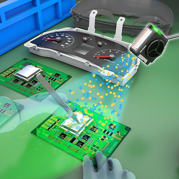 Lors du transfert, les circuits imprimés se chargent d’électricité statique sous l’effet des contacts et séparations répété(e)s avec le convoyeur. Des charges importantes risquent d’engendrer une destruction électrostatique et l’adhérence de corps étrangers, entraînant à leur tour des défauts de fabrication. L’ioniseur élimine efficacement l’électricité statique pour prévenir tout risque de défaut.
