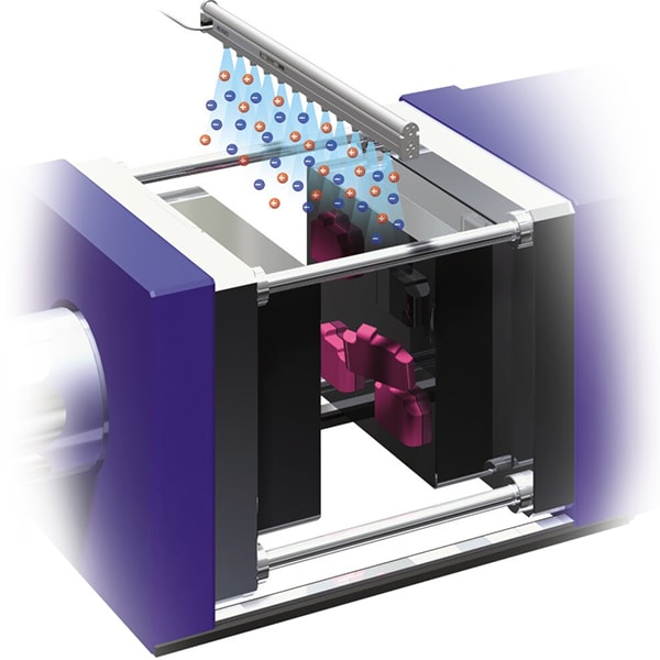Le procédé de moulage par injection peut générer de fortes charges électrostatiques. L’adhérence de corps étrangers, attirés par l’électricité statique, produit des défauts sur les produits. Ils finissent alors au rebut. L’électricité statique peut également entraîner un accrochage du produit au moule. Le produit doit alors être retiré à la main, affectant le rendement. L’ioniseur prévient l’adhérence de corps étrangers et évite tout accrochage du produit au moule.