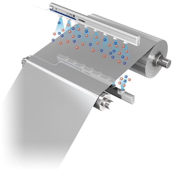 Afin de recouvrir le papier d’une couche de silicone, une très forte charge électrostatique (50 à 100 kV) est générée dans le papier autocollant, entraînant un risque d’adhérence de corps étrangers, d’étincelles et d’inconfort de l’opérateur. L’ioniseur prévient ces problèmes.