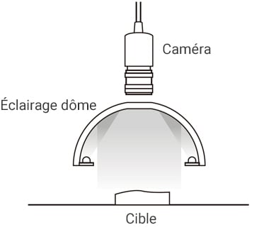 Un éclairage dôme émet une lumière indirecte dans plusieurs directions grâce à la disposition des LED, qui éclairent l’intérieur du dôme. Avec un éclairage standard, la réflexion directe produite par la pièce peut créer une tache lumineuse (halo), qui pose des problèmes d’inspection et de fiabilité. Comme la lumière émise par un éclairage dôme est diffusée dans toutes les directions, une cible à forme complexe peut être éclairée de façon uniforme sous tous les angles, ce qui élimine les taches lumineuses. Une cible éclairée de façon uniforme permet de réaliser facilement une inspection stable et fiable.