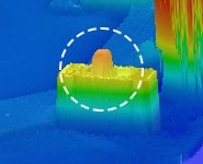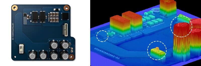 Un motif à rayures est projeté à haute vitesse. La lumière réfléchie par la cible est analysée en temps réel par le capteur d’image CMOS ultra-haute vitesse et un processeur haute vitesse pour générer une image 3D.