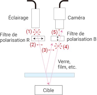 Le filtre polarisant A polarise la lumière (1), de sorte que seule la lumière horizontale (2) est transmise vers la cible. Le filtre polarisant B est placé de façon à ne laisser passer que la lumière verticale, de sorte que la réflexion spéculaire (3) provenant de la surface du film est rejetée. La composante verticale (5) de la réflexion diffuse (4) provenant de la cible est cependant transmise à travers B à la caméra.